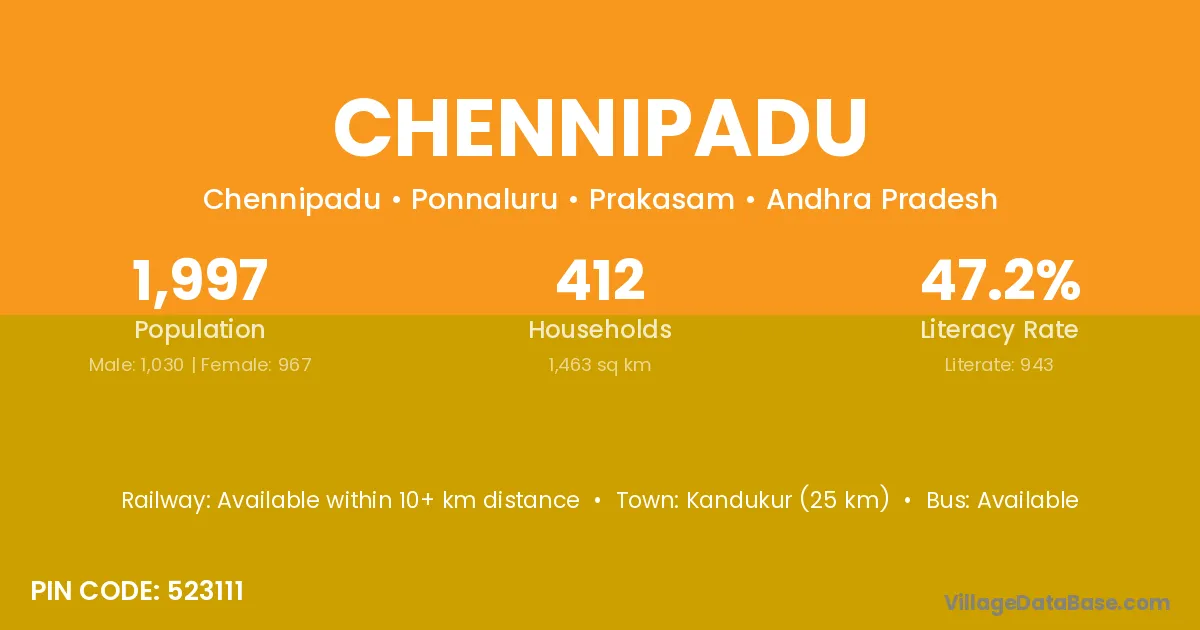 Kandukur (25 km) is the nearest town to Chennipadu village for major economic activities and is located approximately 25 km away.