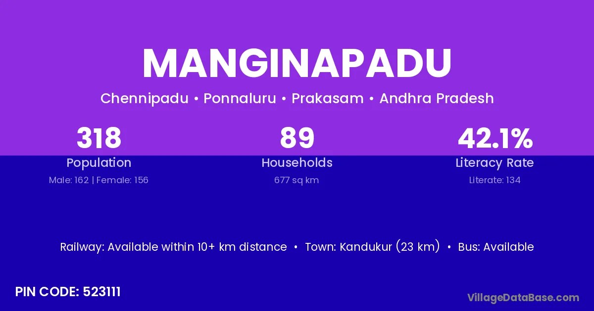 Kandukur (23 km) is the nearest town to Manginapadu village for major economic activities and is located approximately 23 km away.