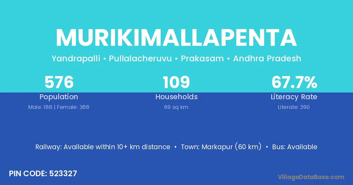 Markapur (60 km) is the nearest town to Murikimallapenta village for major economic activities and is located approximately 60 km away.