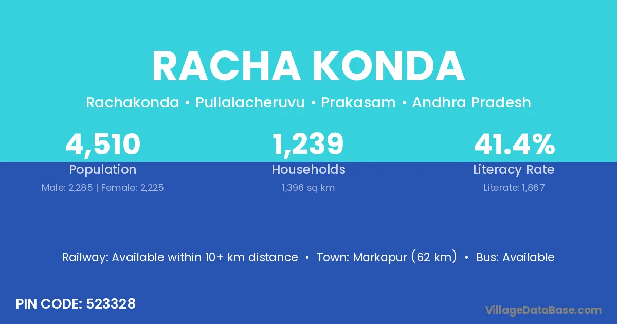 Racha Konda village has a total population of 4,510 people, of which 2,285 are males and 2,225 are females.