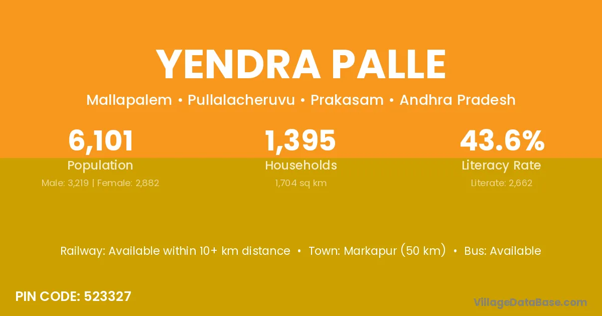 Markapur (50 km) is the nearest town to Yendra Palle village for major economic activities and is located approximately 50 km away.