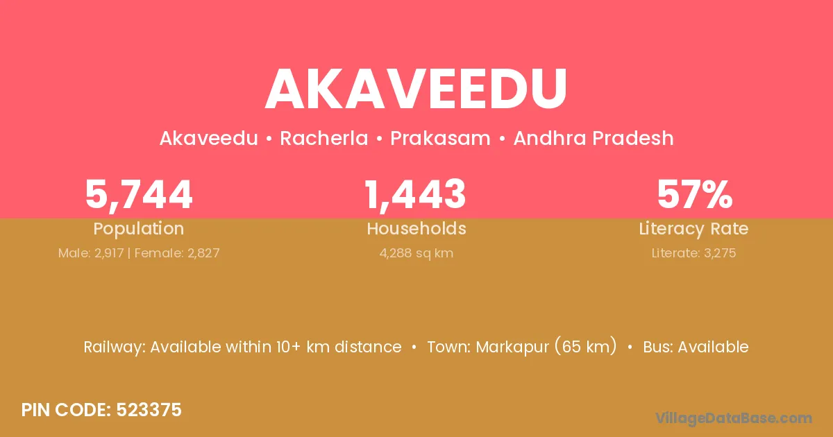 Markapur (65 km) is the nearest town to Akaveedu village for major economic activities and is located approximately 65 km away.
