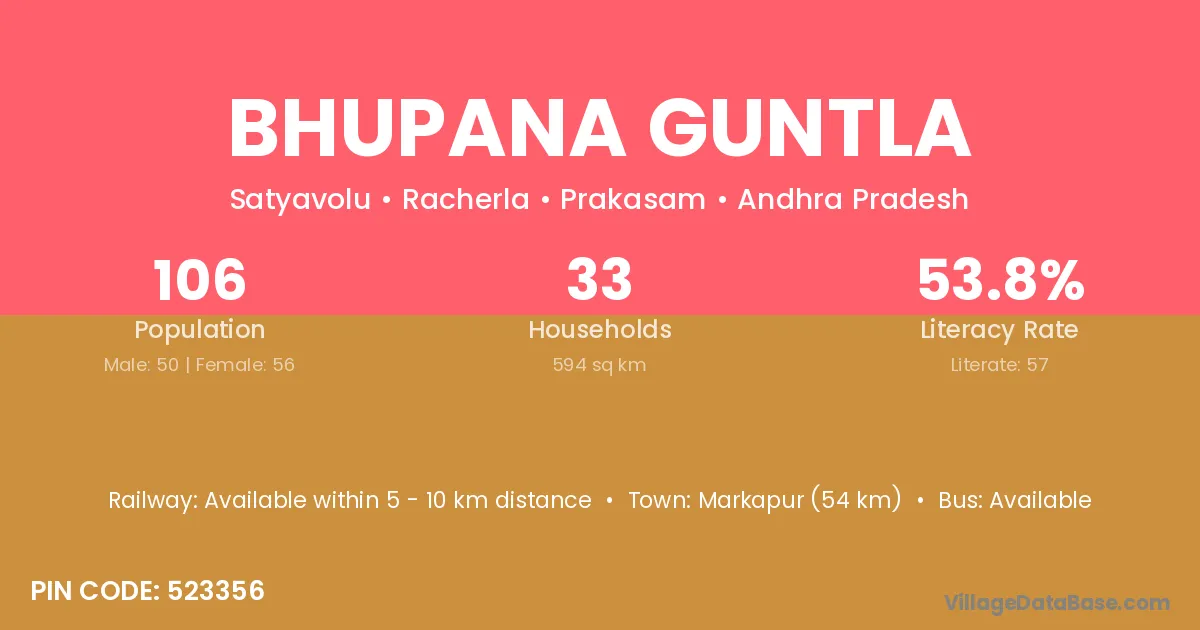 Bhupana Guntla village has a total population of 106 people, of which 50 are males and 56 are females.