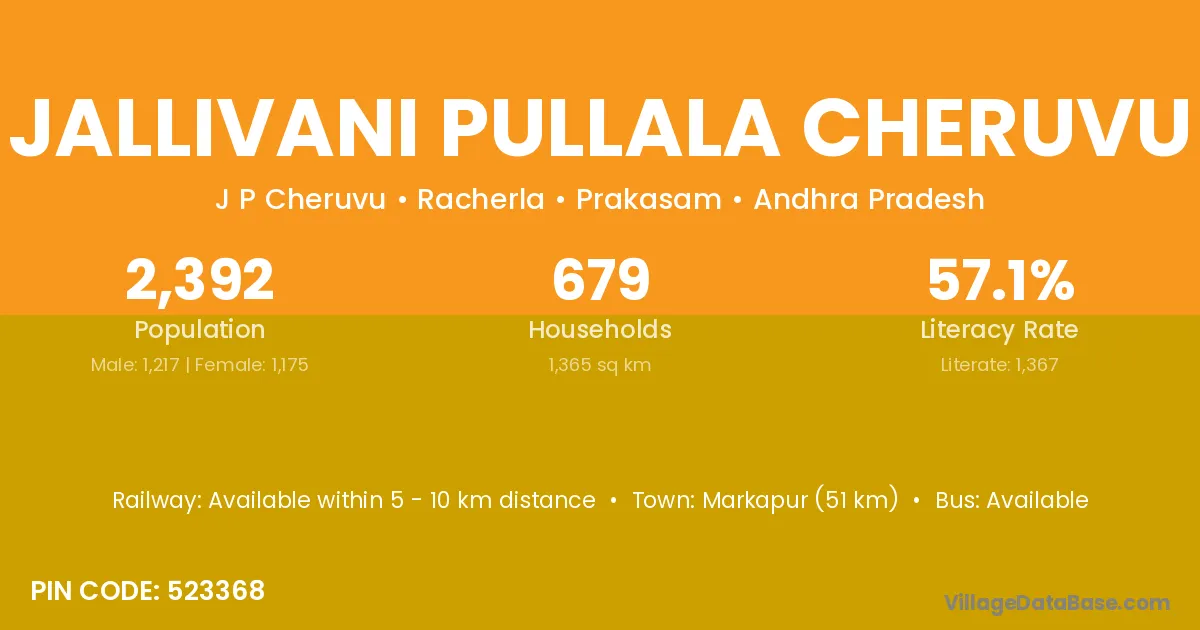 Jallivani Pullala Cheruvu village has a total population of 2,392 people, of which 1,217 are males and 1,175 are females.