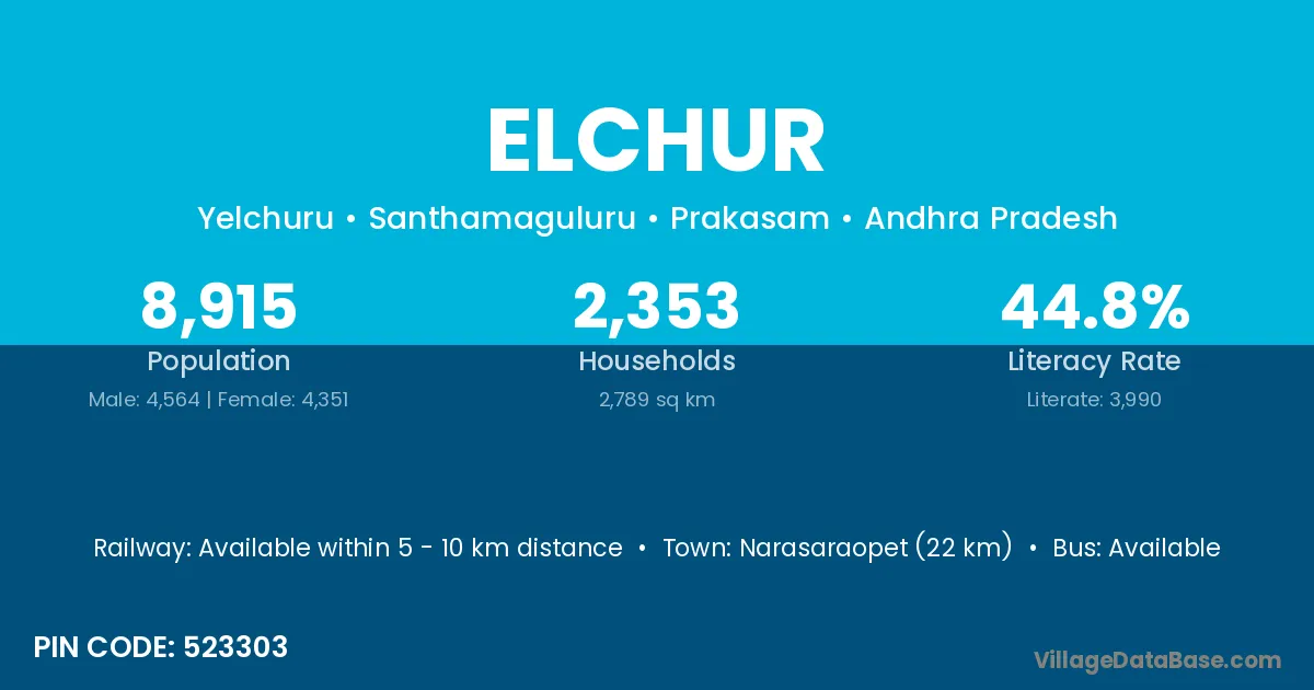 Narasaraopet (22 km) is the nearest town to Elchur village for major economic activities and is located approximately 22 km away.