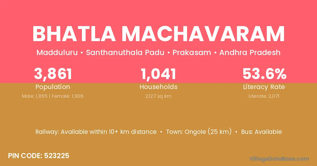 Bhatla Machavaram village has a total population of 3,861 people, of which 1,955 are males and 1,906 are females.