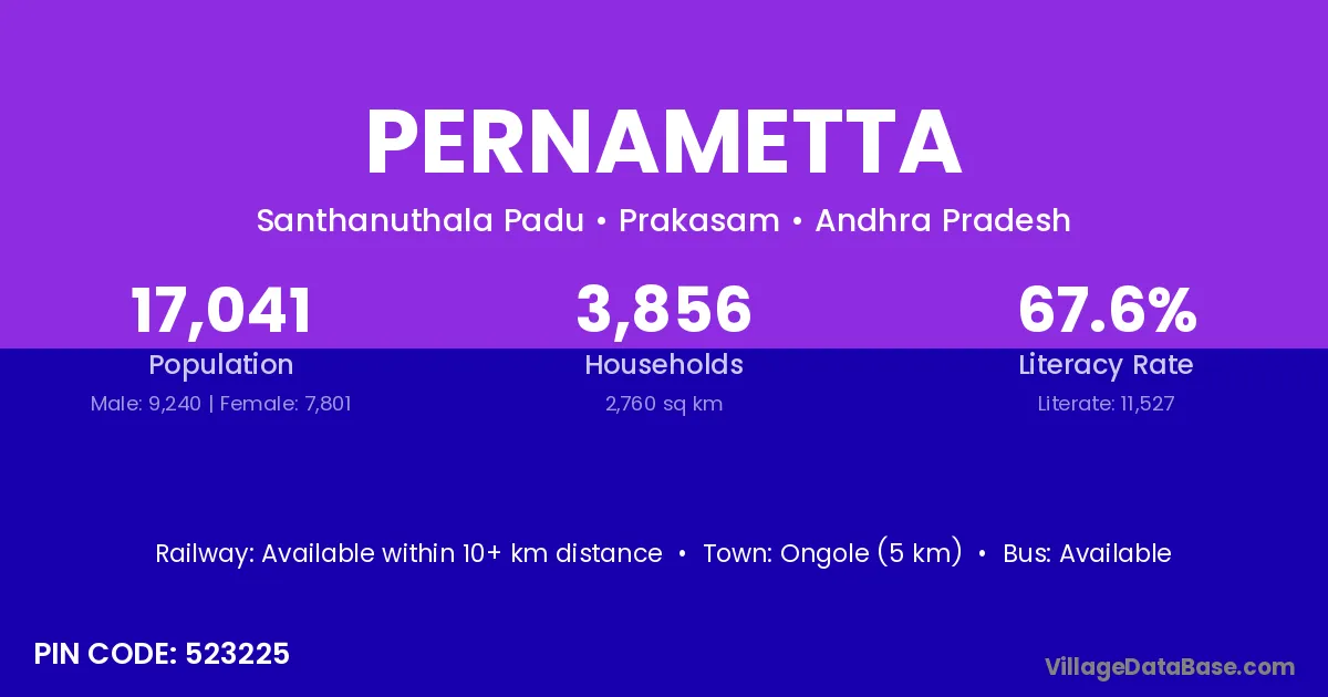 Ongole (5 km) is the nearest town to Pernametta village for major economic activities and is located approximately 5 km away.