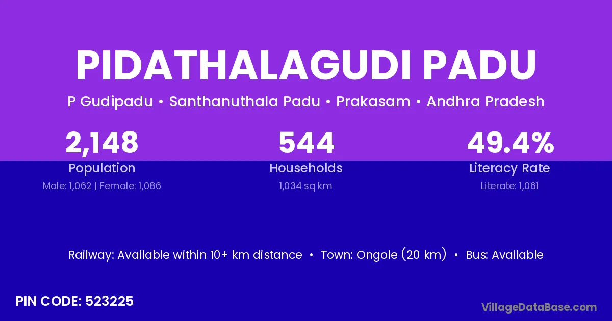 Ongole (20 km) is the nearest town to Pidathalagudi Padu village for major economic activities and is located approximately 20 km away.