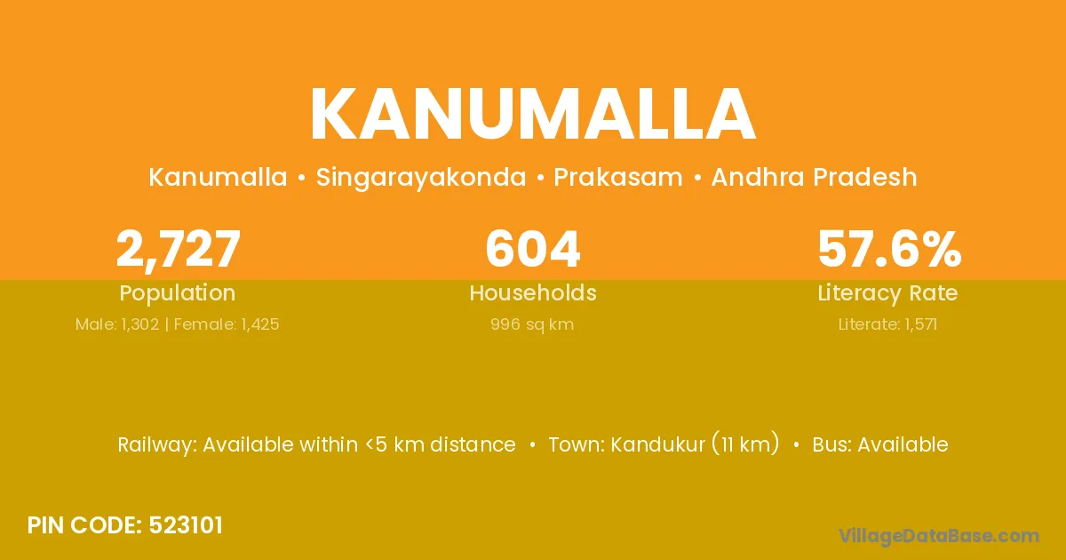 Kandukur (11 km) is the nearest town to Kanumalla village for major economic activities and is located approximately 11 km away.