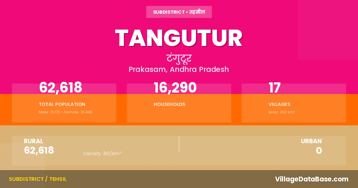 According to the 2011 census The total area of Tangutur Mandal is 202 km², with a population of 62618 people. The population density is 310 inhabitants per square kilometre, and there are approximately 16290 houses in the sub district.