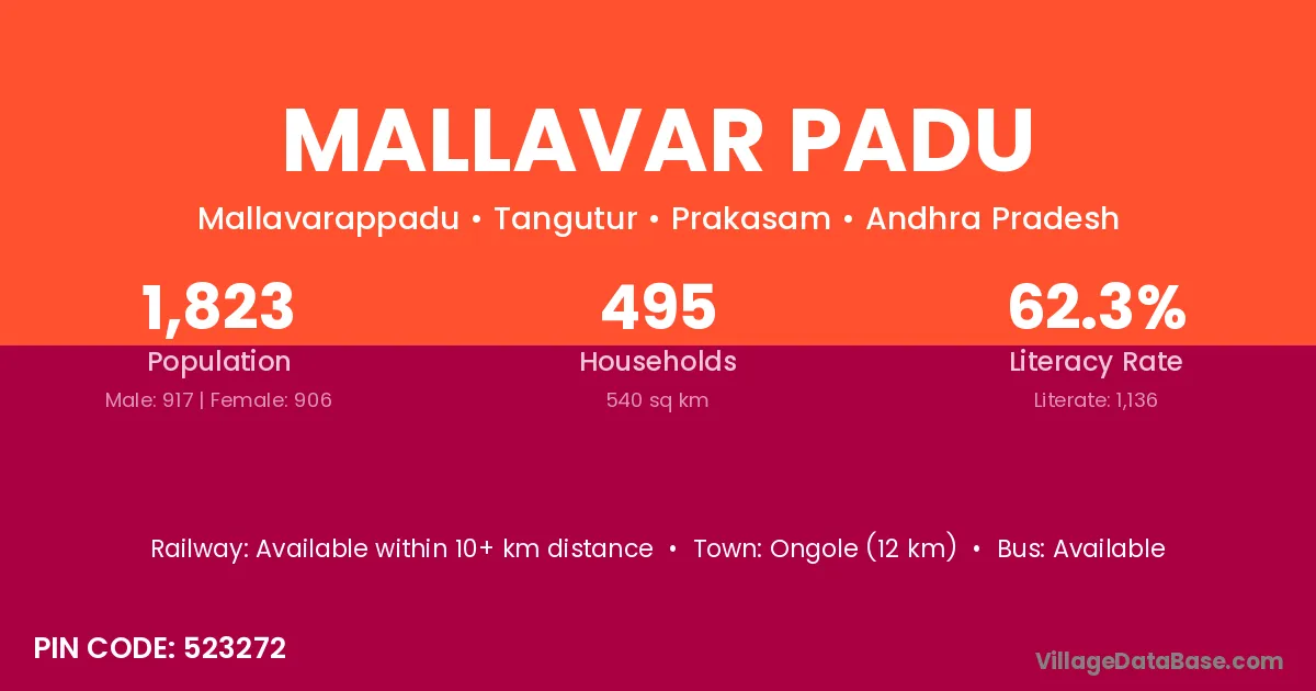 Ongole (12 km) is the nearest town to Mallavar Padu village for major economic activities and is located approximately 12 km away.