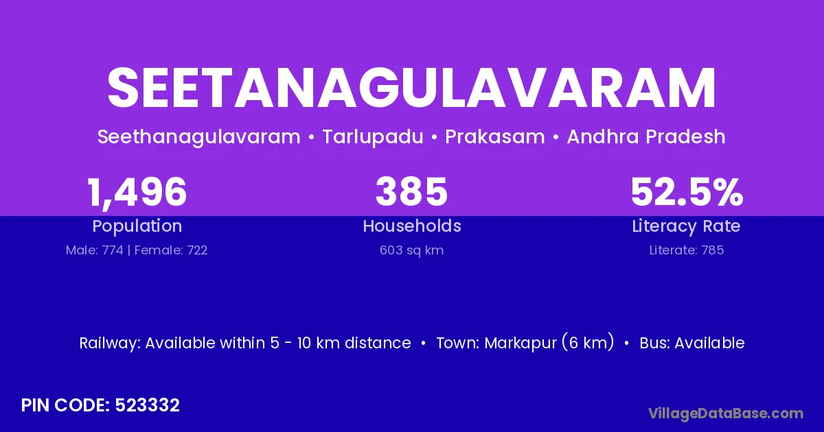 Markapur (6 km) is the nearest town to Seetanagulavaram village for major economic activities and is located approximately 6 km away.