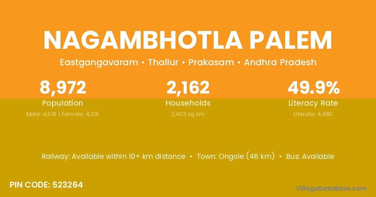 Ongole (46 km) is the nearest town to Nagambhotla Palem village for major economic activities and is located approximately 46 km away.