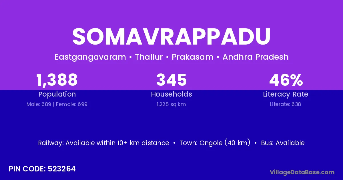 Ongole (40 km) is the nearest town to Somavrappadu village for major economic activities and is located approximately 40 km away.
