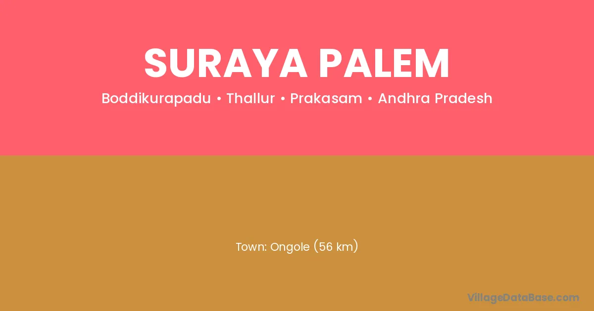 Ongole (56 km) is the nearest town to Suraya Palem village for major economic activities and is located approximately 56 km away.