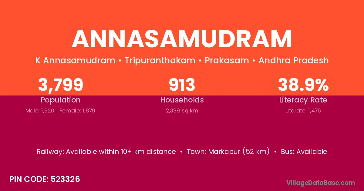 Annasamudram village has a total population of 3,799 people, of which 1,920 are males and 1,879 are females.
