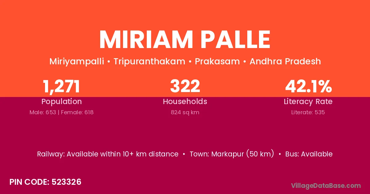 Markapur (50 km) is the nearest town to Miriam Palle village for major economic activities and is located approximately 50 km away.