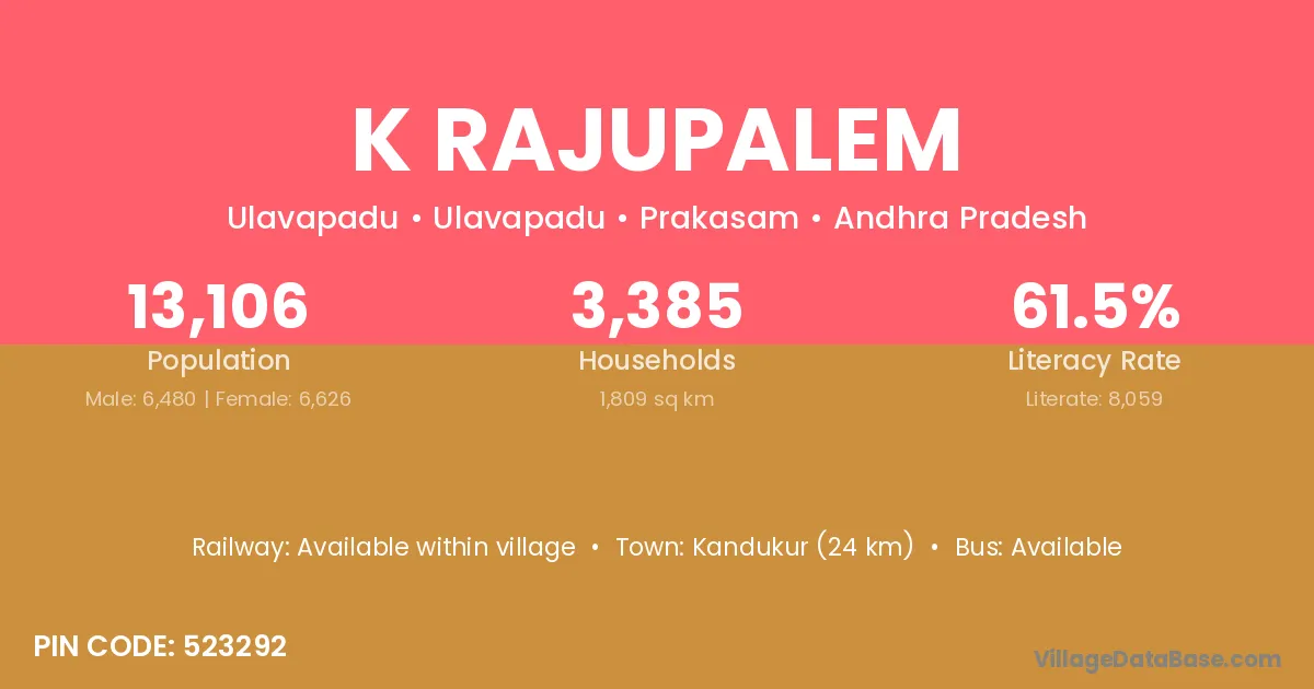 Kandukur (24 km) is the nearest town to K Rajupalem village for major economic activities and is located approximately 24 km away.