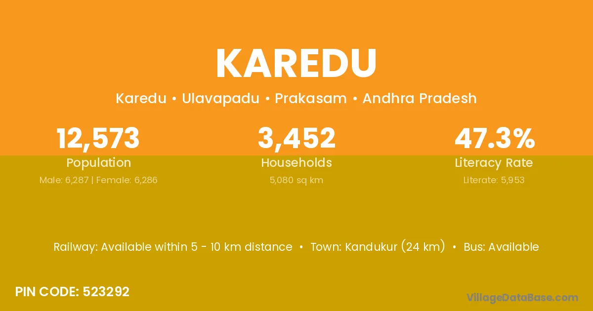 Karedu village has a total population of 12,573 people, of which 6,287 are males and 6,286 are females.
