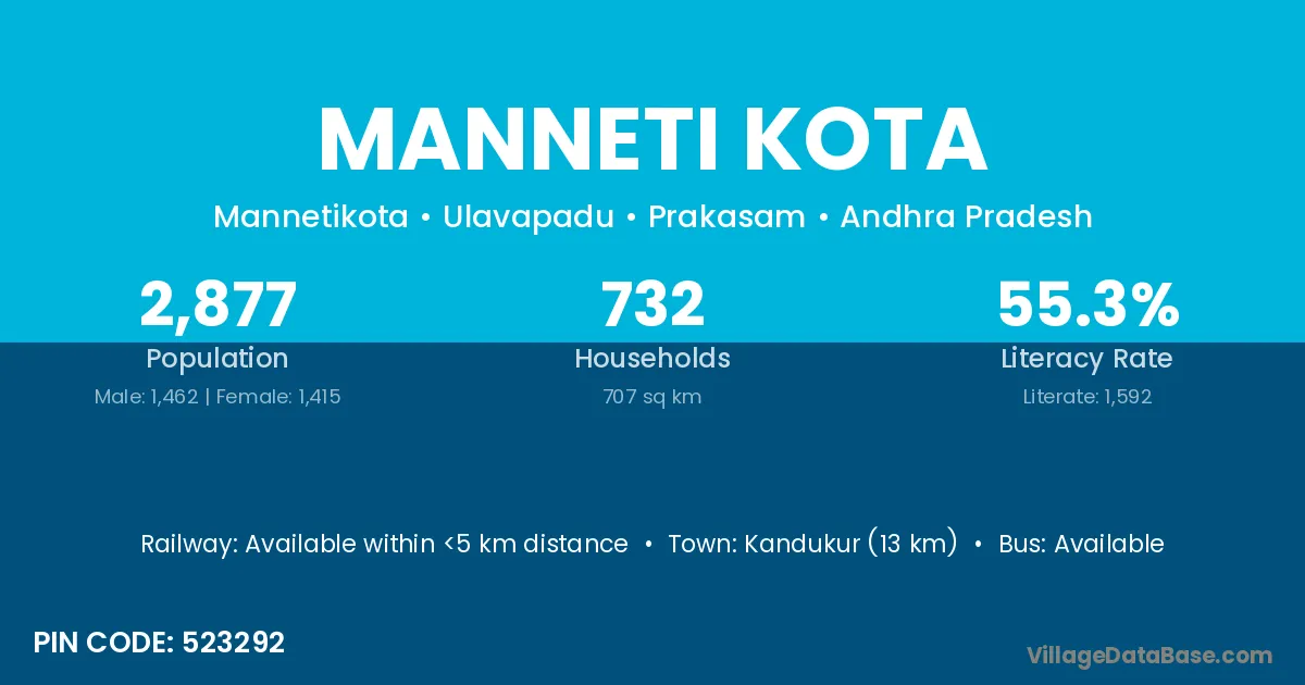 Manneti Kota village has a total population of 2,877 people, of which 1,462 are males and 1,415 are females.