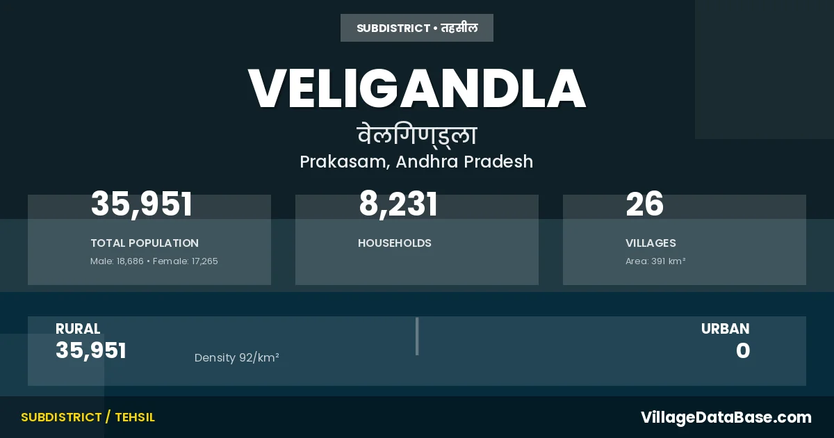 According to the 2011 census The total area of Veligandla Mandal is 391 km², with a population of 35951 people. The population density is 92 inhabitants per square kilometre, and there are approximately 8231 houses in the sub district.