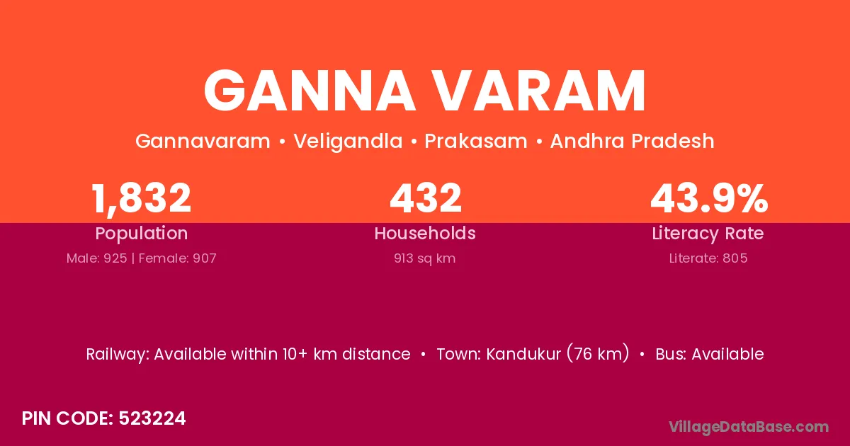 Kandukur (76 km) is the nearest town to Ganna Varam village for major economic activities and is located approximately 76 km away.