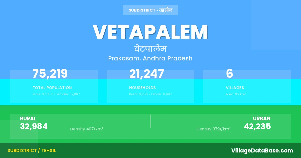 According to the 2011 census The total area of Vetapalem Mandal is 92 km², with a population of 75219 people. The population density is 816 inhabitants per square kilometre, and there are approximately 21247 houses in the sub district.