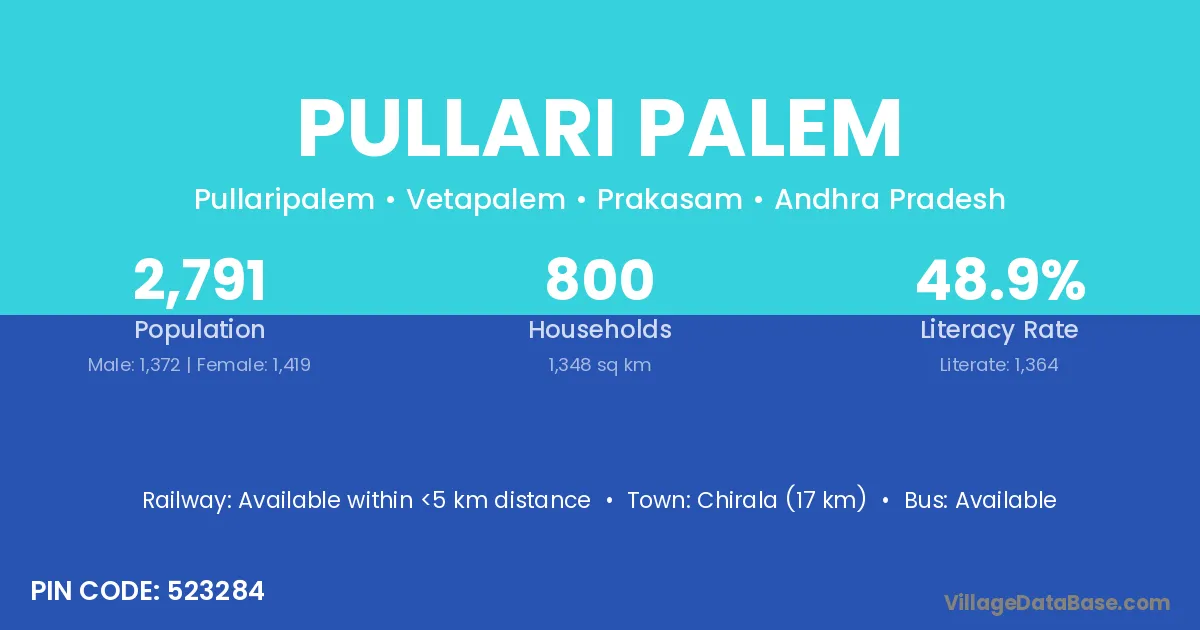 Chirala (17 km) is the nearest town to Pullari Palem village for major economic activities and is located approximately 17 km away.