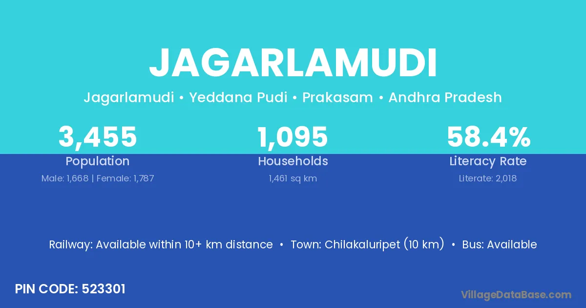 Jagarlamudi village has a total population of 3,455 people, of which 1,668 are males and 1,787 are females.