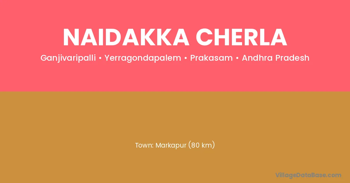 Markapur (80 km) is the nearest town to Naidakka Cherla village for major economic activities and is located approximately 80 km away.