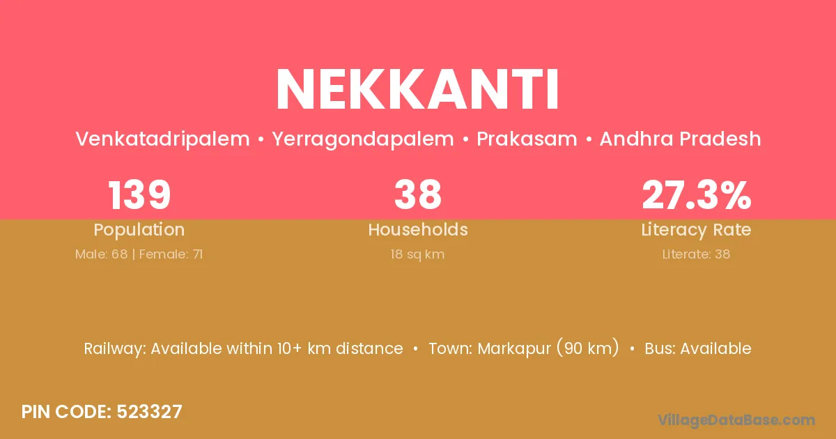 Markapur (90 km) is the nearest town to Nekkanti village for major economic activities and is located approximately 90 km away.
