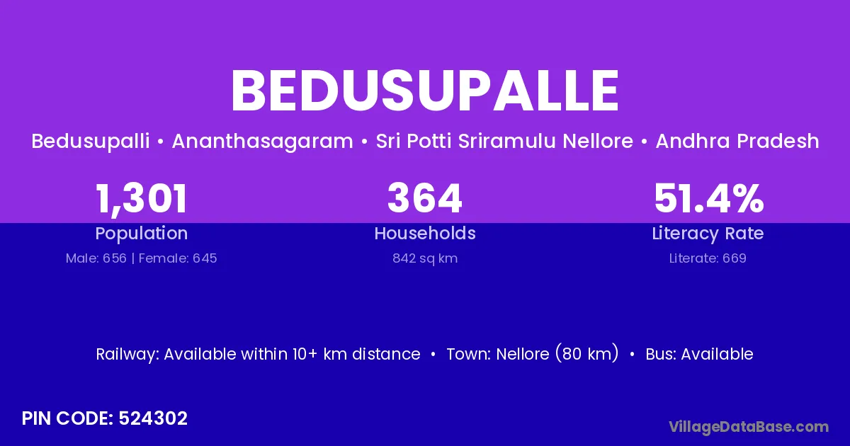 Nellore (80 km) is the nearest town to Bedusupalle village for major economic activities and is located approximately 80 km away.