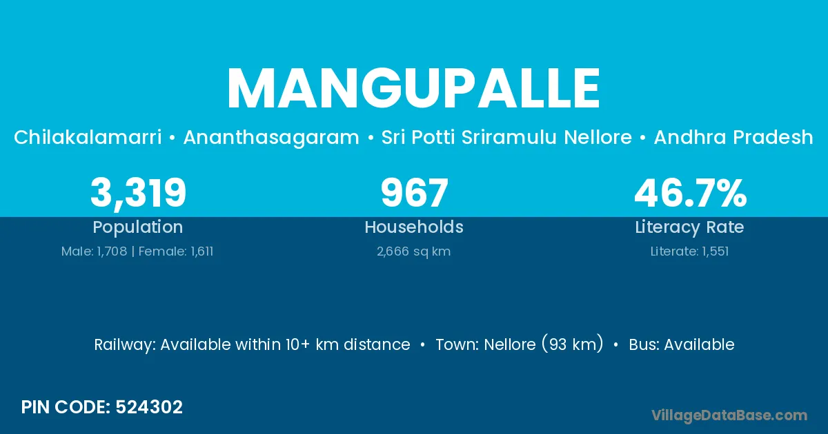 Nellore (93 km) is the nearest town to Mangupalle village for major economic activities and is located approximately 93 km away.