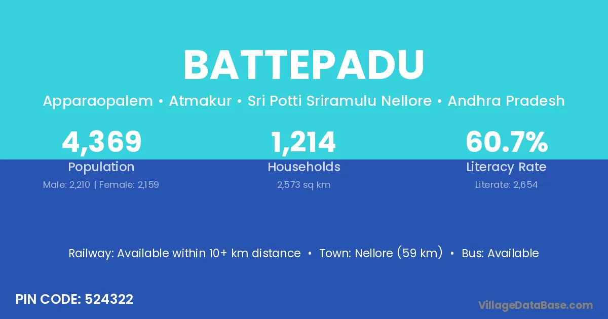 Nellore (59 km) is the nearest town to Battepadu village for major economic activities and is located approximately 59 km away.