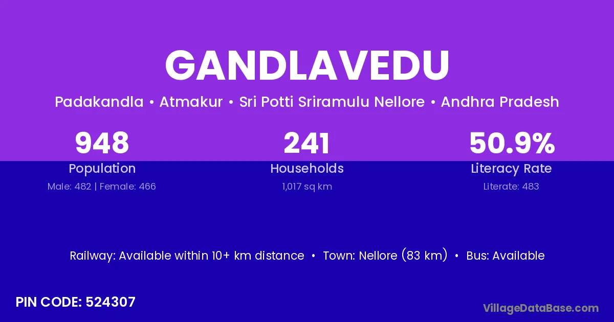 Gandlavedu village has a total population of 948 people, of which 482 are males and 466 are females.