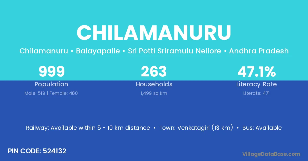 Venkatagiri (13 km) is the nearest town to Chilamanuru village for major economic activities and is located approximately 13 km away.