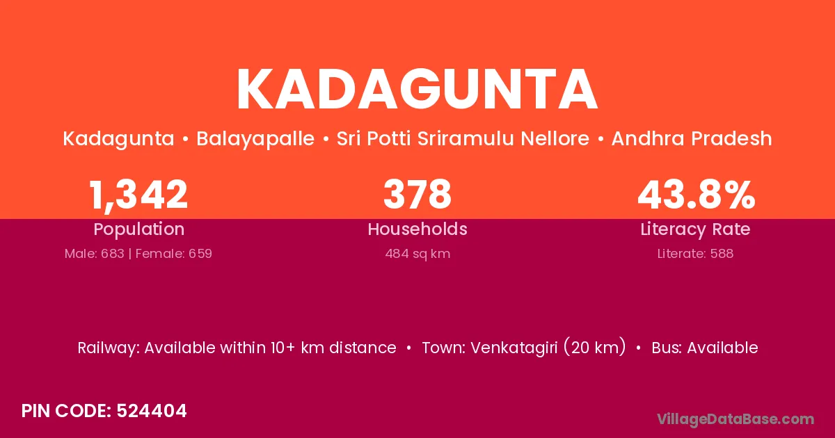 Venkatagiri (20 km) is the nearest town to Kadagunta village for major economic activities and is located approximately 20 km away.