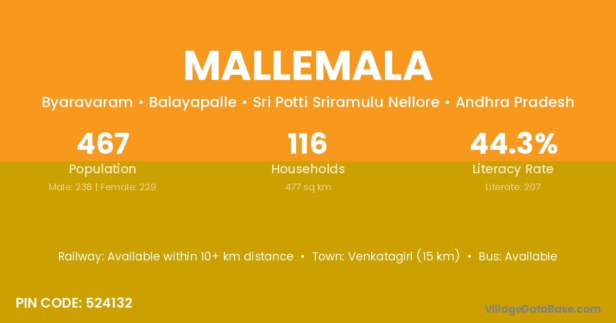 Venkatagiri (15 km) is the nearest town to Mallemala village for major economic activities and is located approximately 15 km away.