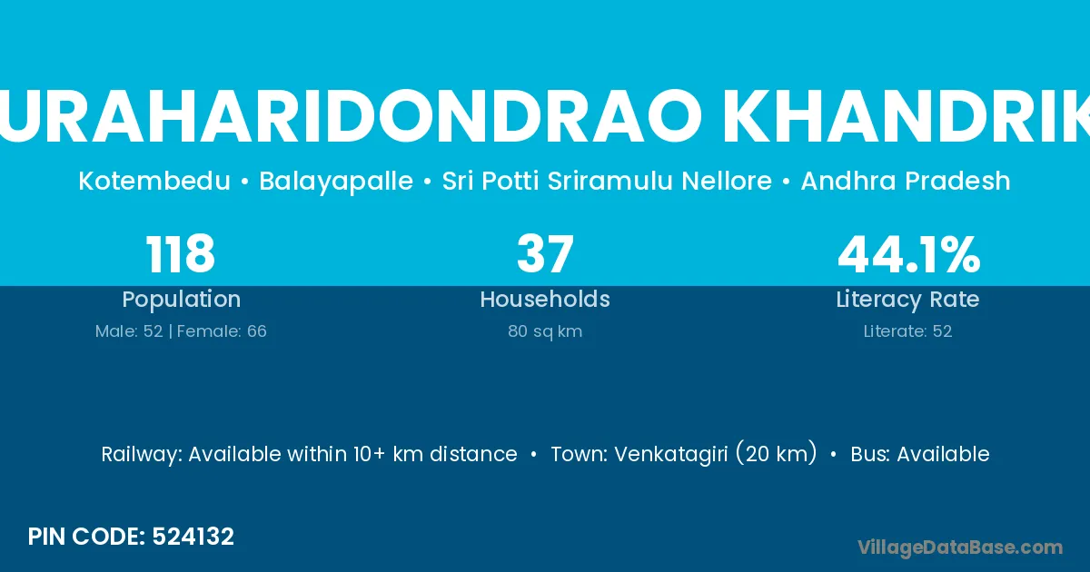 Venkatagiri (20 km) is the nearest town to Muraharidondrao Khandrika village for major economic activities and is located approximately 20 km away.