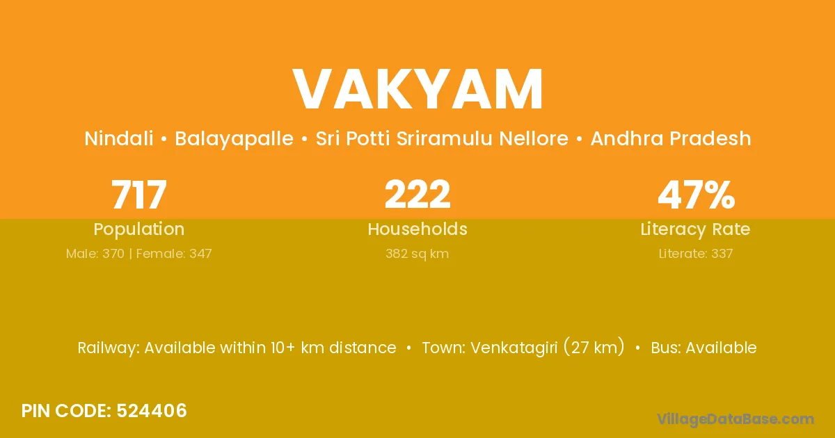 Venkatagiri (27 km) is the nearest town to Vakyam village for major economic activities and is located approximately 27 km away.