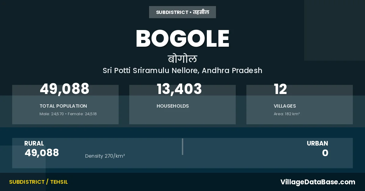 According to the 2011 census The total area of Bogole Mandal is 182 km², with a population of 49088 people. The population density is 270 inhabitants per square kilometre, and there are approximately 13403 houses in the sub district.