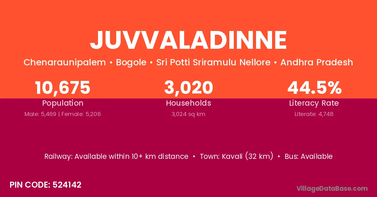 Kavali (32 km) is the nearest town to Juvvaladinne village for major economic activities and is located approximately 32 km away.