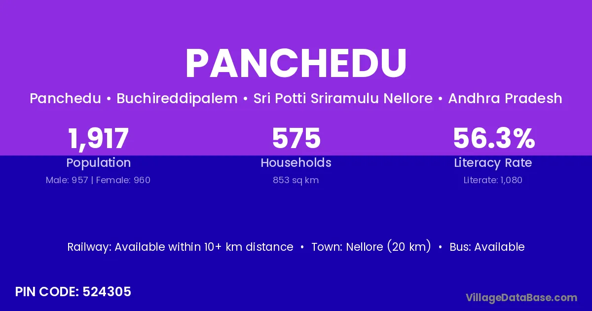 Nellore (20 km) is the nearest town to Panchedu village for major economic activities and is located approximately 20 km away.