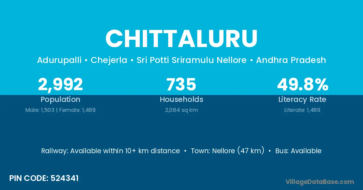 Nellore (47 km) is the nearest town to Chittaluru village for major economic activities and is located approximately 47 km away.