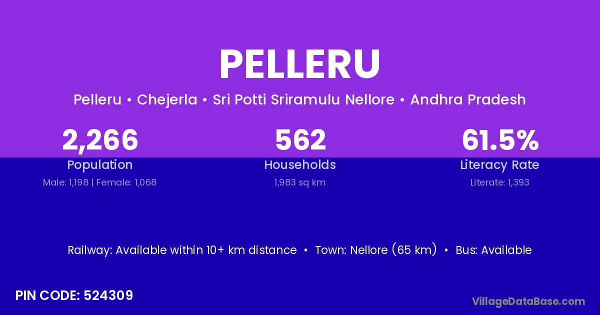 Nellore (65 km) is the nearest town to Pelleru village for major economic activities and is located approximately 65 km away.