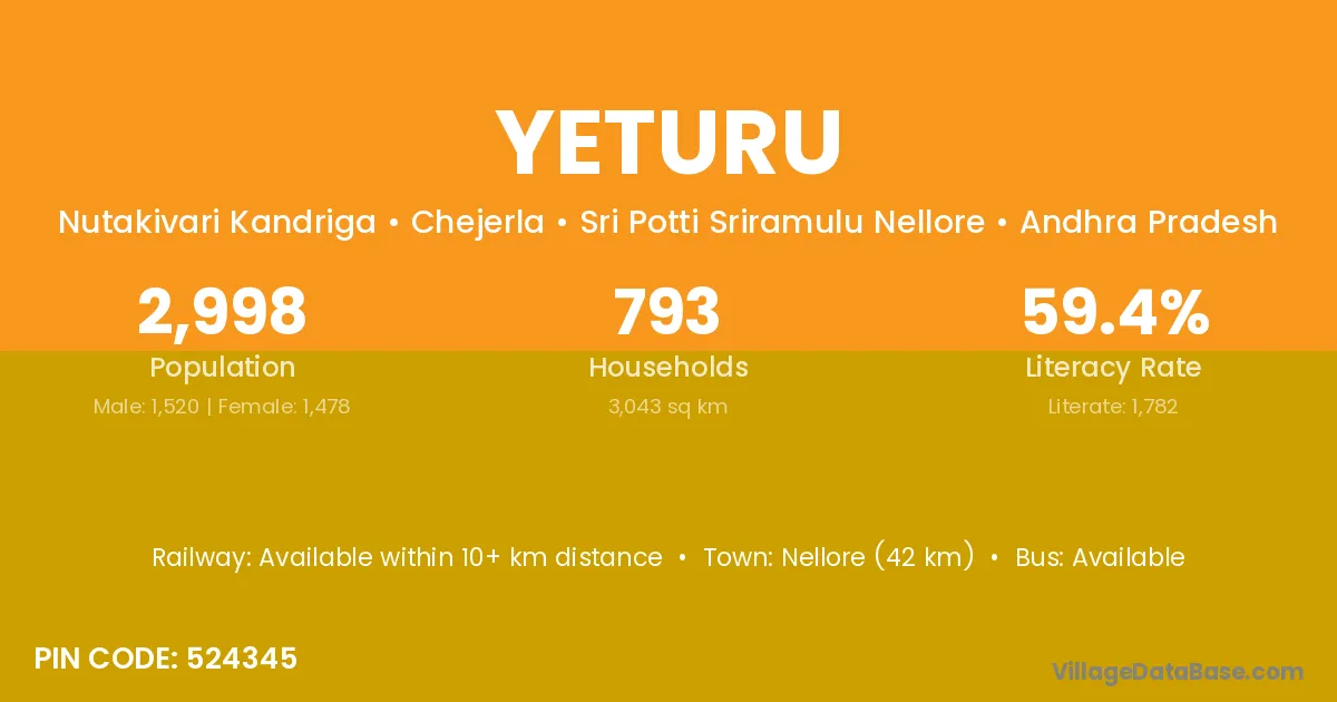 Nellore (42 km) is the nearest town to Yeturu village for major economic activities and is located approximately 42 km away.