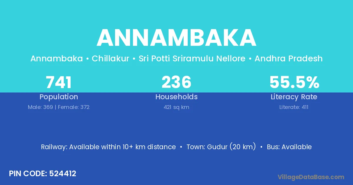 Gudur (20 km) is the nearest town to Annambaka village for major economic activities and is located approximately 20 km away.