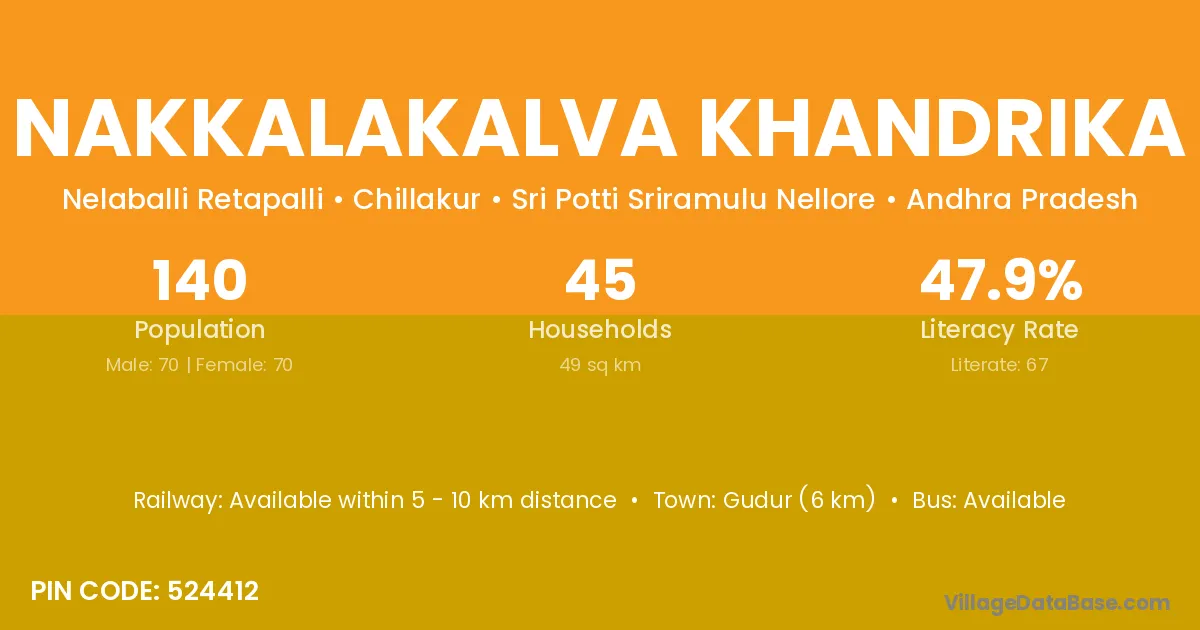 Gudur (6 km) is the nearest town to Nakkalakalva Khandrika village for major economic activities and is located approximately 6 km away.