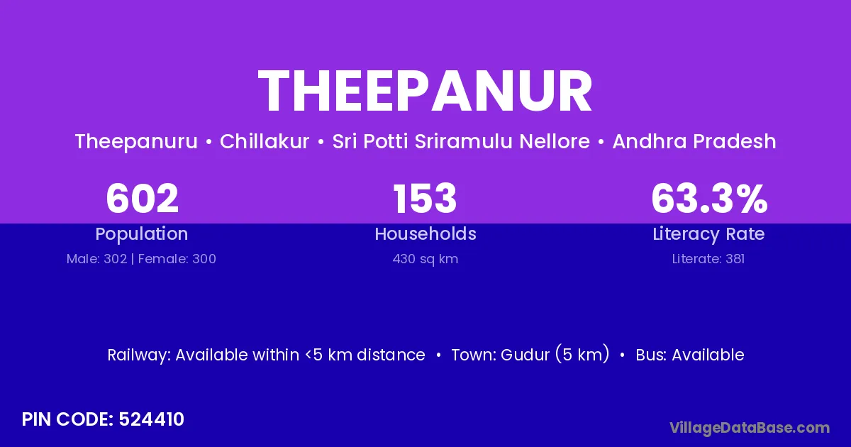Gudur (5 km) is the nearest town to Theepanur village for major economic activities and is located approximately 5 km away.