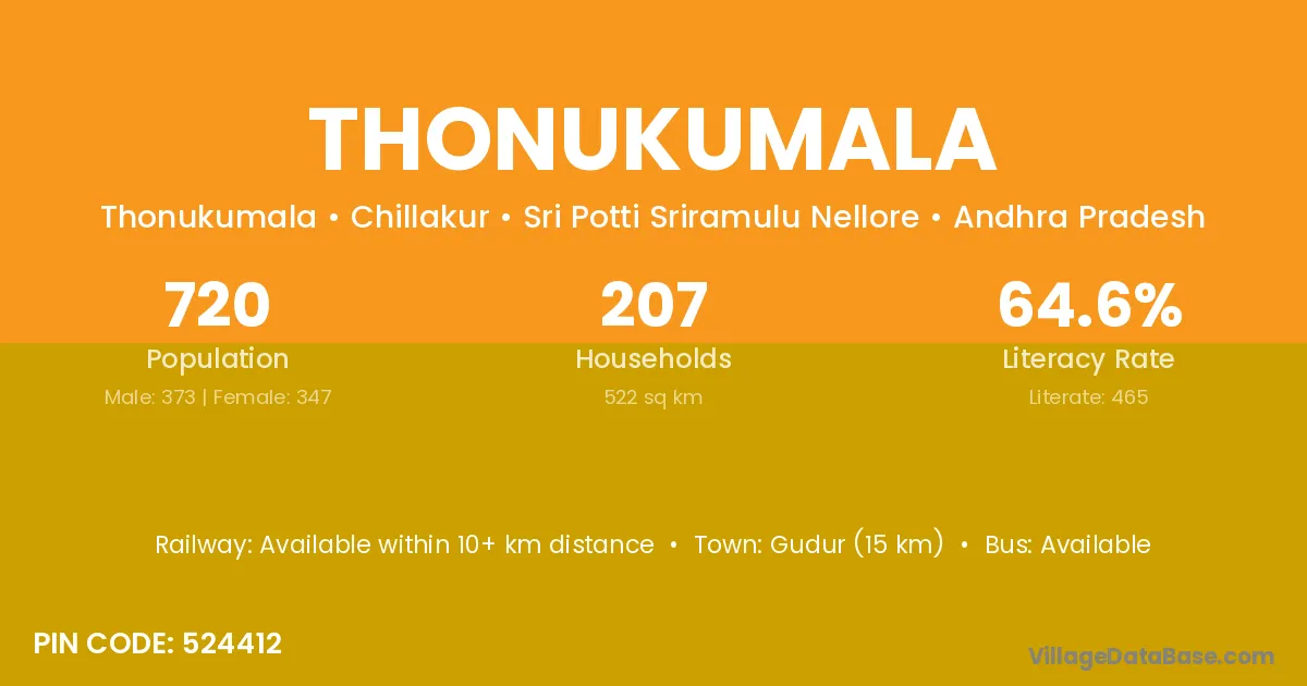 Gudur (15 km) is the nearest town to Thonukumala village for major economic activities and is located approximately 15 km away.